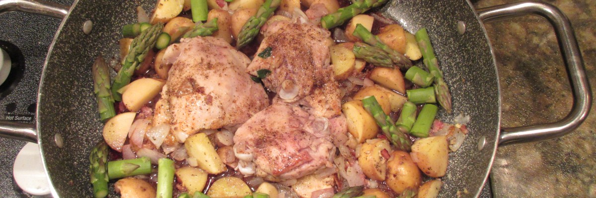 Very trendy right now is the concept of the one sheet pan dinner. I remember our family using this idea ever since I was old enough to shell peas. For one thing, there was hardly time after a busy day in the restaurant, in the house, in the garden, wherever the chores may be, to make a fancy dinner. Yet Chef Dad insisted on fresh, home cooked meals and often demonstrated how to do it quickly. I make this Winner Chicken Dinner regularly because it has all the earmarks of a well rounded meal that tastes delicious.