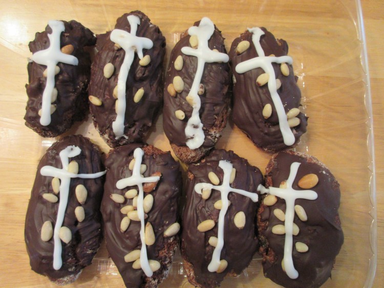 10. Dip into semi-sweet melted chocolate (about 1 package of 1 oz. squares melted at 50% power in microwave, if desired. Sprinkle with more pine nuts and pipe a cross on top with royal icing (2 cups powdered sugar, 2 T water, 2 tsp. orange extract).
