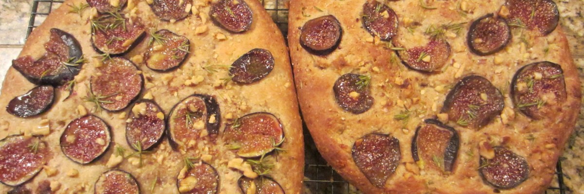 Italy Magazine’s article about the multi grain pizza led me to their recipe for fig and honey focaccia. I’m a focaccia foodie and have made it every which way in past years to sell locally as a caterer. Now I hear it was invented by the Etruscans??! My other haunting research topic!? Here is my recipe for fig and rosemary multi grain focaccia. I adapted Bob’s Red Mill recipe using his quality multi grain bread mix. You can up the oven temp if you wish